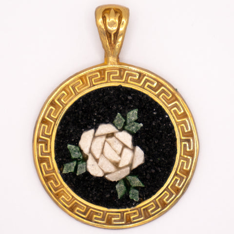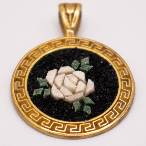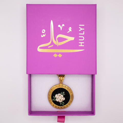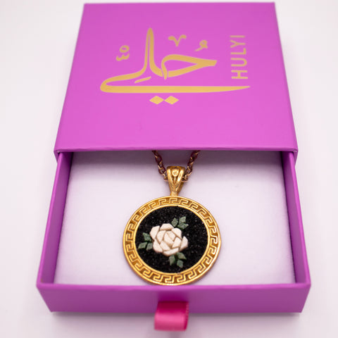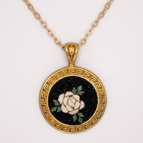 Get bold and sophisticated Hollywood glam style. This heirloom-quality necklace features a delightful white mosaic rose in the center of a black pendant. Full of drama, this necklace will become...